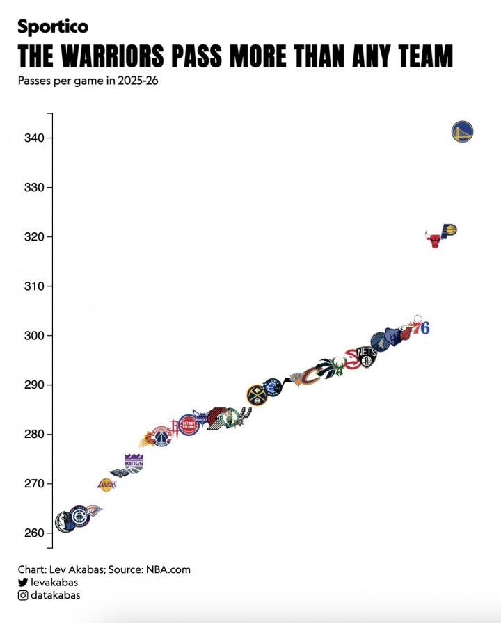 今日,美国体育媒体晒出了25-26赛季联盟30支球队场均传球数排行榜,结果显示金州勇士以340次高居榜首,印第安纳步行者和芝加哥公牛分列二、三位,快船则排在了倒数第二的位置,仅好于达拉斯独行侠。值得一提的是,截至目前,快船场均助攻23.8次,排在联盟倒数第一。
