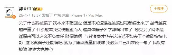 不过就在郭艾伦被好友诈骗近千万的传闻愈演愈烈之时,作为当事人郭艾伦本人终于站出来进行辟谣。郭艾伦在其个人微博发文表示:关于他被骗纯属子虚乌有的假消息,某些媒体为了博点流量和眼球不择手段,这比真骗子还能编吧 !