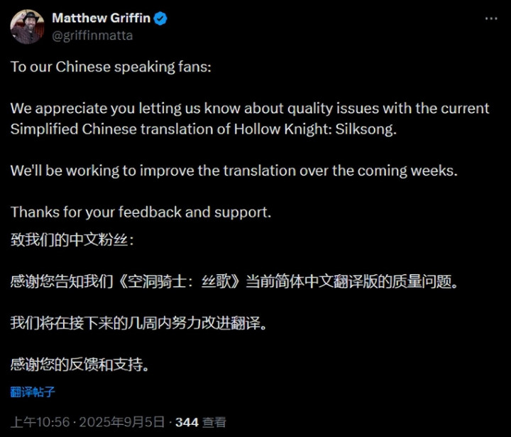 面对汹涌的差评潮,开发商 Team Cherry 的发行营销主管 Matthew Griffin 在社交媒体上回应称: