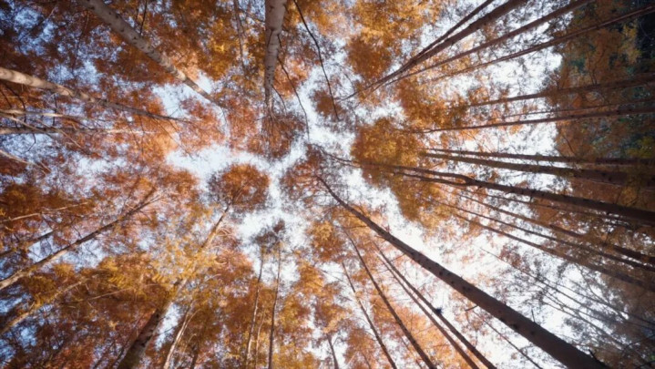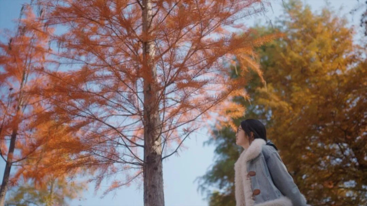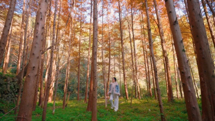 冬日的水杉林在阳光的照射下有着淡淡的金光,地上是青绿的叶片,顶上是橘红的水杉,阳光斜斜地照在空隙之间,将这片小小的秘境装点的如油画一般。