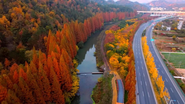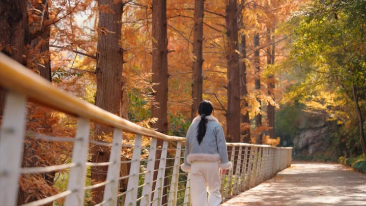 浦江的清晨在薄雾里慢慢铺开,位于同乐的水杉栈道沿着江水的一侧向着远处延伸,水杉的落叶散落在木板上,路过的人踏着这份秋意进入浦江的冬日。同乐的水杉栈道就像是浦江秋冬交接的一角,水杉林从翠绿渐变为红色,拨开云雾的阳光透过枝叶落在水杉与栈道上,红绿交织的颜色渲染了整个视野,撕开了冬日的萧瑟。