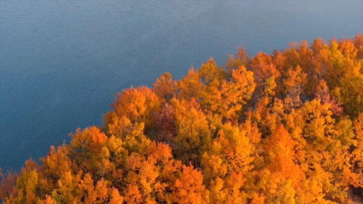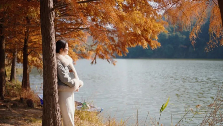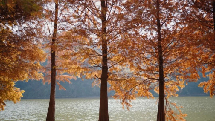 成排的水杉就像是天然的画框,将美景收束在枝干之间,鲜红的枝叶垂在半空,填满了画框的一侧,剩下的湖面带着大片大片的细闪布满整个空隙,真实的枝干与虚幻的波影交相辉映,虚实难辨,让路过的游人看得微微出神。