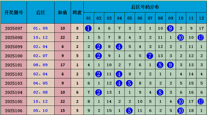 后区分析:上期后区开出05 10,和值15,较上期和值下降,本期预计和值会上升,看好号码06 12,和值18。