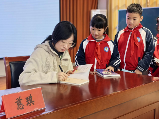 互动环节更是气氛热烈,小读者们踊跃举手,围绕“写作遇到瓶颈怎么办”“书中角色的灵感来源”等问题积极提问。慈琪作家耐心细致地逐一解答,时而温柔鼓励,时而妙语连珠,现场掌声与笑声不断。孩子们还纷纷拿出自己珍藏的书籍,排队等待作家签名,近距离感受文学偶像的魅力,脸上洋溢着激动与喜悦。